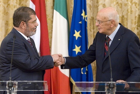 Il Presidente Giorgio Napolitano con Mohamed Morsi, Presidente della Repubblica Araba d'Egitto al termine delle dichiarazioni alla stampa