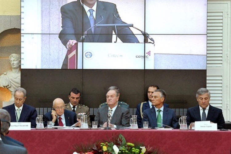 Il Presidente Giorgio Napolitano con S.M. il Re di Spagna Juan Carlos I e il Presidente della Repubblica Portoghese Annibal Cavaco Silva durante la sessione finale del Simposio nel patio de Asturias