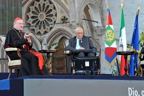 Il Presidente Giorgio Napolitano con S. Em. Rev.ma il Cardinale Gianfranco Ravasi al dialogo sul tema 'Dio, questo sconosciuto. Dialogo tra credenti e non credenti', 'Cortile dei gentili'