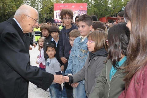 Il Presidente Giorgio Napolitano saluta un gruppo di bambini al suo arrivo all'Auditorium del Parco in occasione dell'inaugurazione