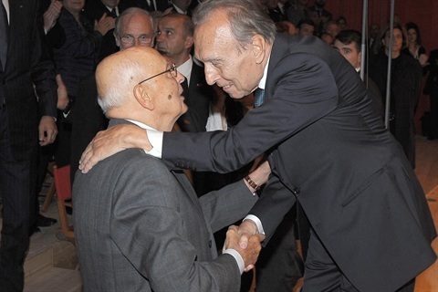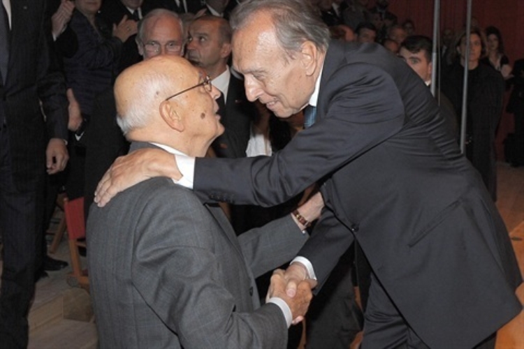 Il Presidente Giorgio Napolitano con il Maestro Claudio Abbado all'Auditorium del Parco de L'Aquila in occasione dell'inaugurazione
