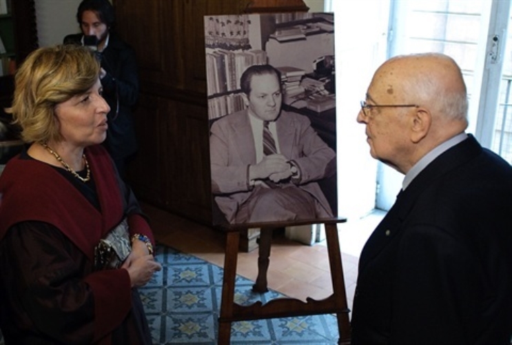 Il Presidente Giorgio Napolitano con Marta Herling-Grudzinski dinanzi ad una foto del padre Gustaw