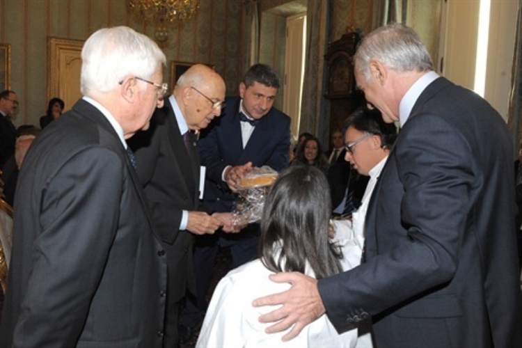 Il Presidente Giorgio Napolitano riceve gli omaggi realizzati dai ragazzi stagisti in occasione della Giornata Internazionale delle persone con Disabilità
