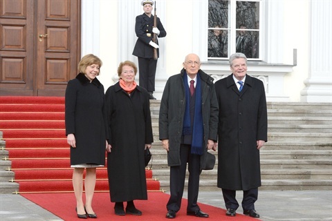 Il Presidente della Repubblica e la Signora Napolitano al loro arrivo al Castello di Bellevue sono accolti dal Presidente Federale Gauck e dalla Signora Schadt in occasione del pranzo di Stato