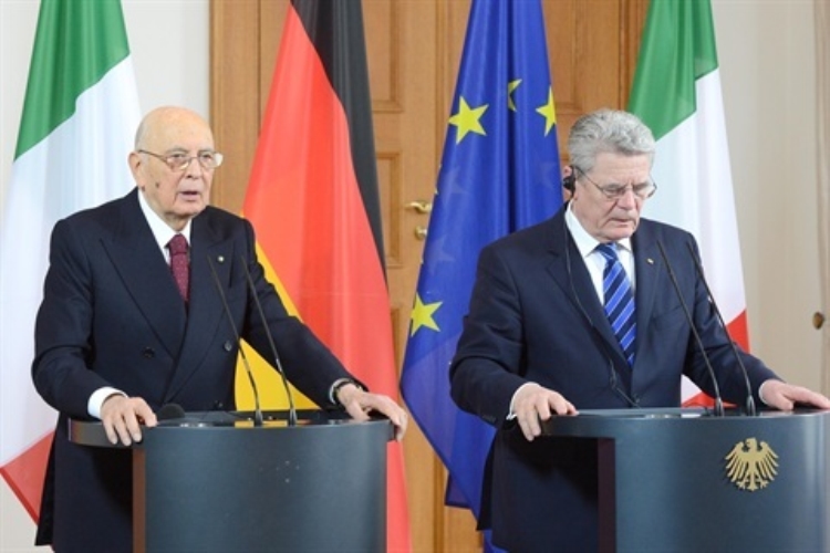 Il Presidente della Repubblica Giorgio Napolitano e il Presidente Federale Gauck durante la conferenza stampa