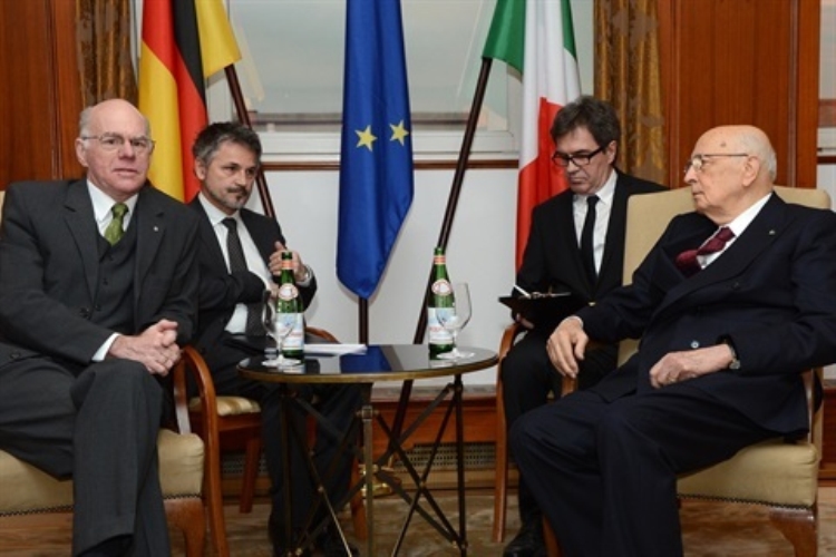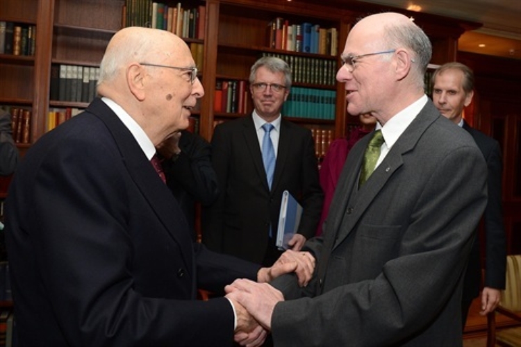 Il Presidente della Repubblica Giorgio Napolitano nel corso dell'incontro con i "pensatori" tedeschi dedicato ai temi europei