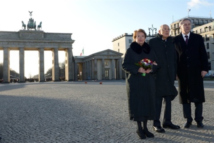 Il Presidente Giorgio Napolitano la signora Clio e il Sindaco e Governatore del Land di Berlino Klaus Wowereit di fronte alla Porta di Brandeburgo in occasione della Visita di Stato nella Repubblica Federale di Germania