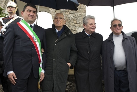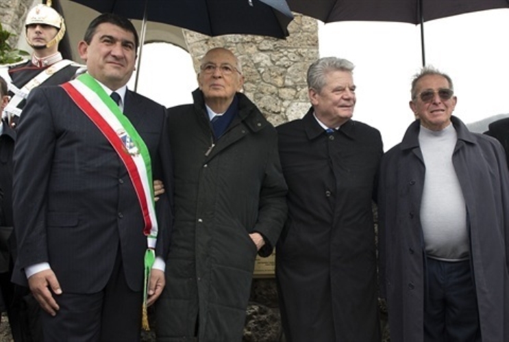 Il Presidente Giorgio Napolitano e il Presidente della Repubblica Federale di Germania Joachim Gauck con il Sindaco di Stazzema Michele Silicani e il Sig. Enrico Pieri, superstite della strage del 12 agosto 1944, dinanzi all'ossario di Sant'Anna di Stazzema