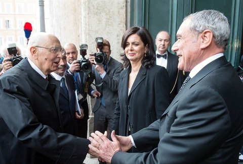 Il Presidente Giorgio Napolitano accolto dal Presidente del Senato Pietro Grasso e dal Presidente della Camera Laura Boldrini al suo arrivo a Palazzo Montecitorio in occasione della cerimonia di giuramento davanti al Parlamento in seduta comune
