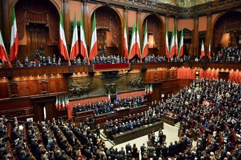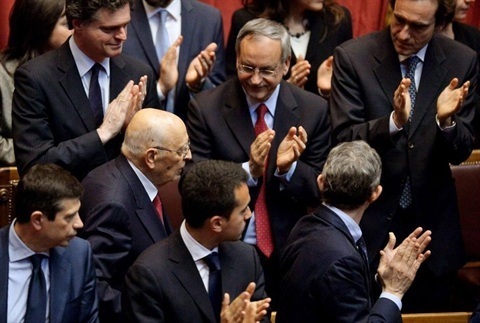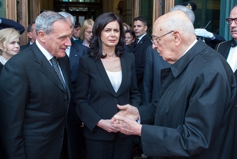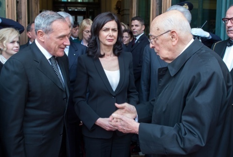 Il Presidente Giorgio Napolitano saluta il Presidente del Senato Pietro Grasso e il Presidente della Camera Laura Boldrini al termine della cerimonia di giuramento davanti al Parlamento in seduta comune