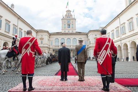 Il Presidente Giorgio Napolitano durante gli onori militari passa in rassegna il reparto d'onore schierato con bandiera e banda, al Quirinale