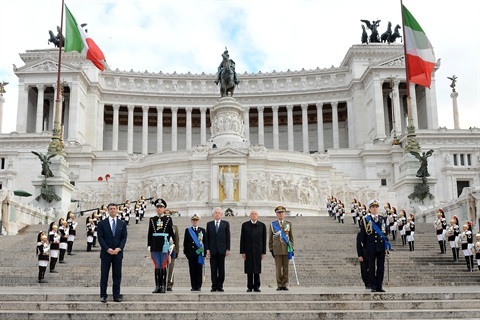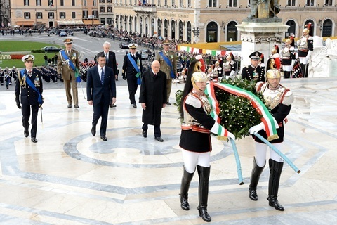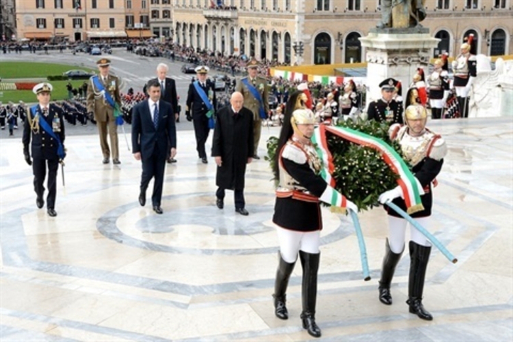 Il Presidente Giorgio Napolitano durante gli onori militari in occasione della deposizione di una corona d'alloro sulla tomba del Milite Ignoto all'Altare della Patria