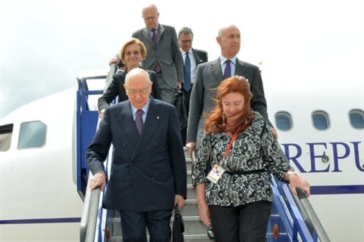 Il Presidente Giorgio Napolitano accompagnato dal Ministro degli Affari Esteri, Emma Bonino, al suo arrivo all'aeroporto di Zagabria in occasione delle celebrazioni per l'adesione della Repubblica di Croazia all'Unione Europea