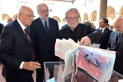Il Presidente Giorgio Napolitano con il maestro Antonio Nocera visita la mostra "I libri d'Acqua" nel Chiostro del Monastero di San Nicolò