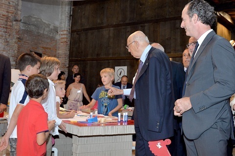 Il Presidente Giorgio Napolitano saluta alcuni bambini durante la visita alla 55° Esposizione Internazionale d'Arte dal titolo "Il Palazzo Enciclopedico"