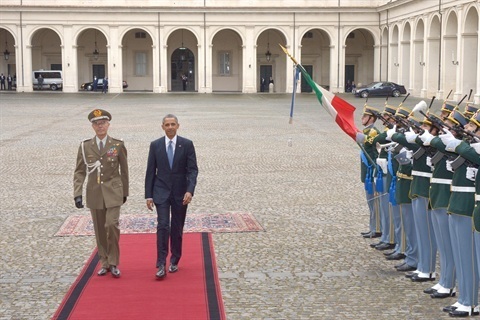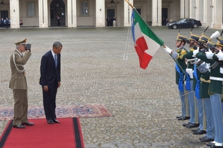 Il Presidente degli Stati Uniti d'America, Barack Obama, con il Consigliere Militare del Presidente della Repubblica, Rolando Mosca Moschini, passa in rassegna un reparto schierato per gli onori