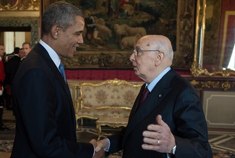 Il Presidente della Repubblica italiana, Giorgio Napolitano, accoglie il Presidente degli Stati Uniti d'America, Barack Obama al Quirinale