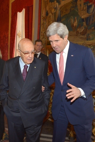 Il Presidente Giorgio Napolitano con S.E. il Signor John Kerry, Segretario di Stato in occasione della visita del Presidente degli Stati Uniti d'America in Italia