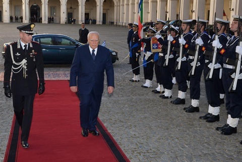 Il Presidente della Repubblica Ellenica, Karolos Papoulias, al suo arrivo al Quirinale passa in rassegna un reparto con Bandiera per gli onori