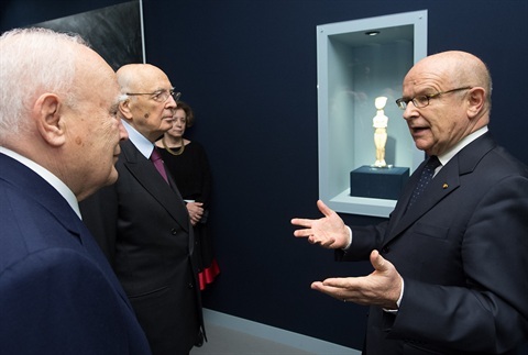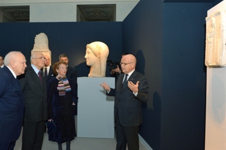 Il Presidente Giorgio Napolitano e il Presidente della Repubblica Ellenica Karolos Papoulias nel corso della visita alla mostra dal titolo "Classicità ed Europa. Il destino della Grecia e dell'Italia", allestita al Quirinale e illustrata dal Prof. Louis Godart