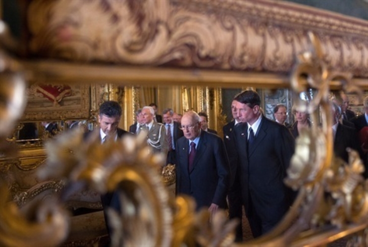 Il Presidente Giorgio Napolitano e il Presidente della Repubblica di Slovenia Borut Pahor attraversano i saloni del Palazzo del Quirinale