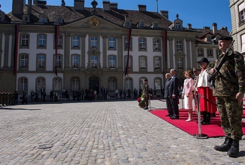 Il Presidente Giorgio Napolitano, il Presidente della Confederazione Svizzera Didier Burkhalter e le rispettive consorti nel corso della cerimonia di benvenuto
