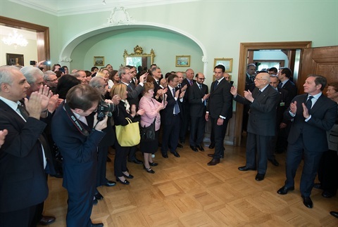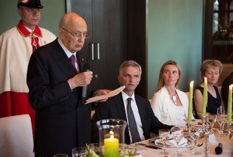 Il Presidente Giorgio Napolitano con il Ministro degli Affari Esteri, Federica Mogherini, nel corso dell'incontro allargato alle delegazioni ufficiali