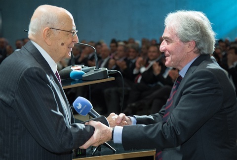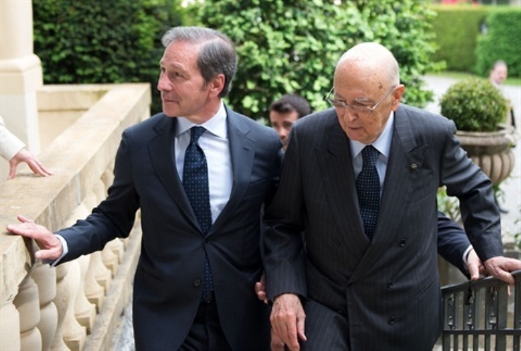 Il Presidente Giorgio Napolitano saluta Pietro Martiroli, Presidente dell'Università della Svizzera Italiana