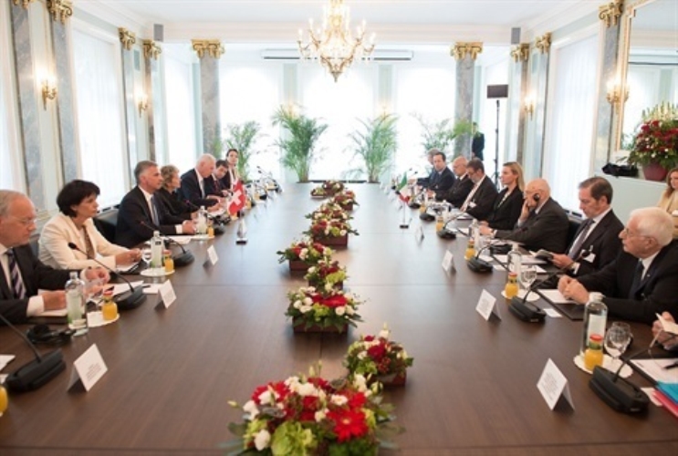 Il Presidente Giorgio Napolitano con il Presidente della Confederazione Svizzera Didier Burkhalter nel corso dell'incontro allargato alle delegazioni ufficiali