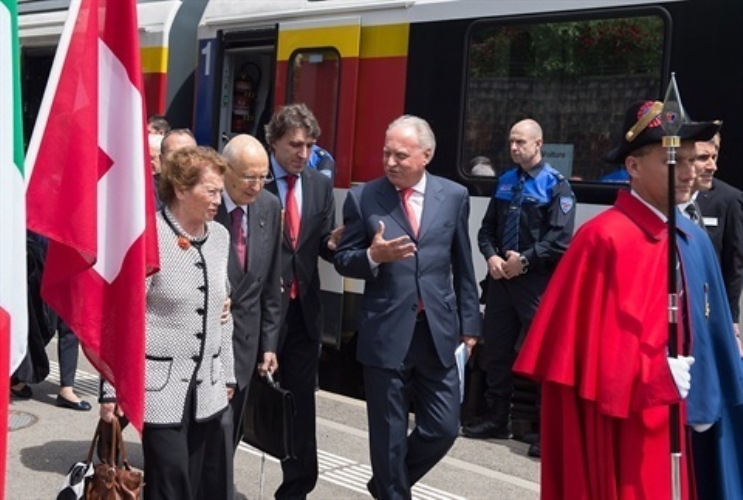 Il Presidente Giorgio Napolitano accolto dal Presidente del Consiglio di Stato del Canton Ticino Manuele Bertoli e dal Cancelliere del Consiglio di Stato del Canton Ticino Giampiero Gianella al suo arrivo alla stazione di Lugano