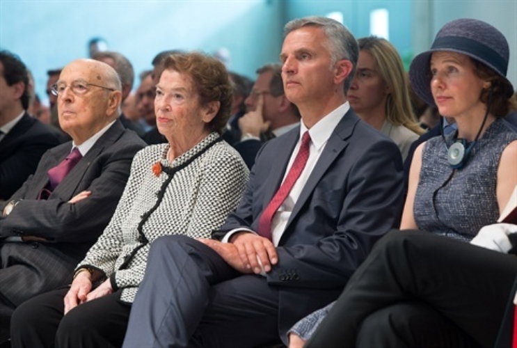 Il Presidente Giorgio Napolitano e il Presidente della Confederazione Svizzera Didier Burkhalter con le rispettive consorti nel corso della conferenza all'Università Svizzera Italiana