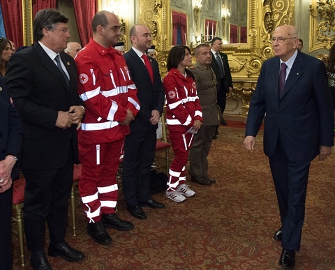Il Presidente Giorgio Napolitano saluta Roberta Fusacchia, Volontaria della C.R.I., al termine dell'incontro con una delegazione di volontari della Croce Rossa Italiana, nel 150° anniversario della nascita del primo "Comitato dell'Associazione per il soccorso ai feriti e ai malati di guerra", al centro il Presidente del Comitato Regionale Sicilia Rosario Maria Gianluca Valastro