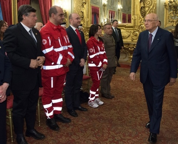 Il Presidente Giorgio Napolitano in occasione dell'incontro con una delegazione di volontari della Croce Rossa Italiana, nel 150° anniversario della nascita del primo "Comitato dell'Associazione per il soccorso ai feriti e ai malati di guerra"