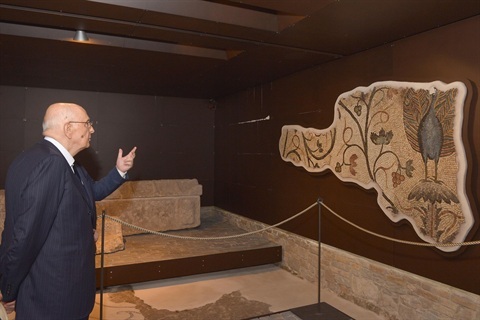 Il Presidente Giorgio Napolitano alla sede della "Fondazione Aquileia" nel corso della visita del Museo , illustrata dal direttore Dott. Cristiano Tiussi