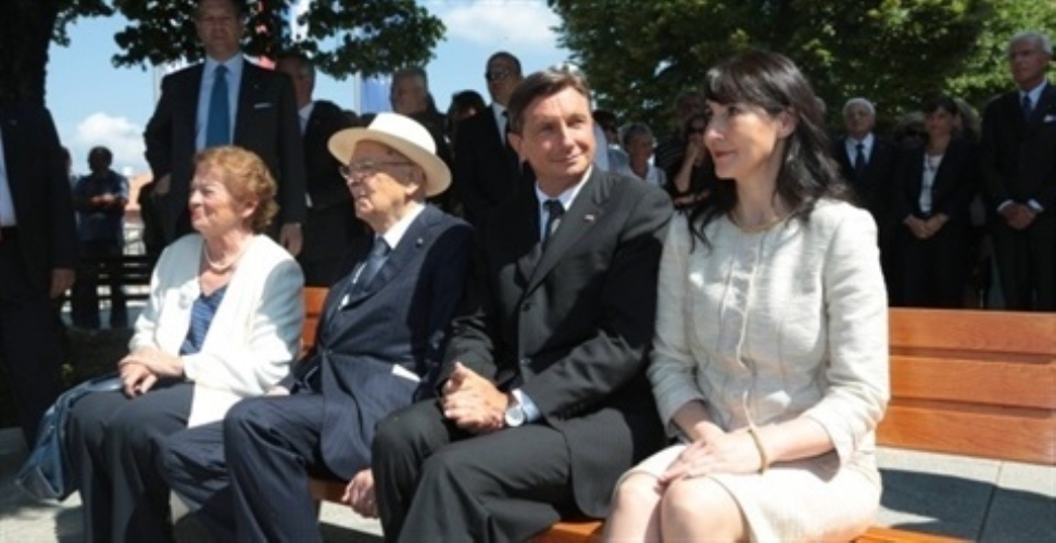 Il Presidente Giorgio Napolitano, il Presidente della Repubblica di Slovenia Borut Pahor e le rispettive consorti sulla "panchina della pace"