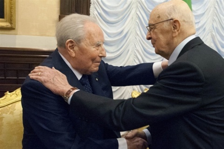 Il Presidente Giorgio Napolitano saluta il Presidente Emerito della Repubblica Carlo Azeglio Ciampi, poco prima della cerimonia celebrativa del 150° dell'Unità d'Italia a Palazzo Montecitorio