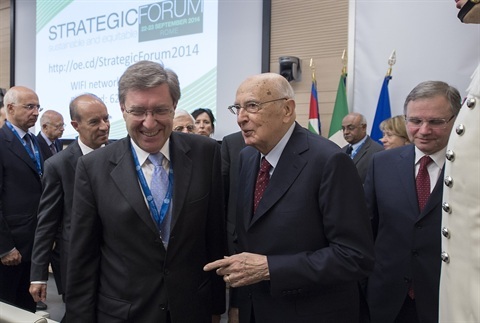 Il Presidente Giorgio Napolitano con Enrico Giovannini e Ignazio Visco, in occasione della sessione di chiusura "Accounting for the long term costs of the recession", nell'ambito del Forum Internazionale organizzato dall'Istituto Einaudi per l'Economia e la Finanza e dalla Banca d'Italia