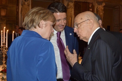 Il Presidente Giorgio Napolitano con il Presidente del Conisglio, Matteo Renzi, e la Cancelliera Angela Merkel in occasione del Pranzo in onore dei Capi delegazione al Vertice ASEM