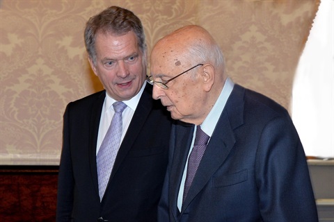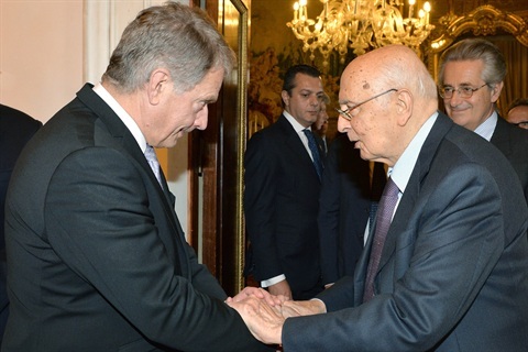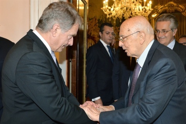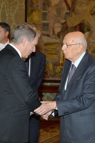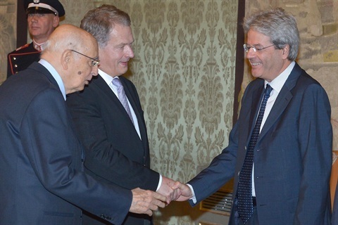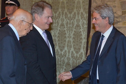 Il Presidente Giorgio Napolitano con il Presidente della Repubblica di Finlandia, Sauli Niinistö, e il Ministro degli Affari Esteri e della Cooperazione Internazionale, Paolo Gentiloni, in occasione della visita al Quirinale del Presidente finlandese