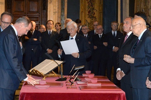 Il Presidente Giorgio Napolitano con il Prof. Nicolò Zanon durante la cerimonia di giuramento dei nuovi giudici della Corte Costituzionale