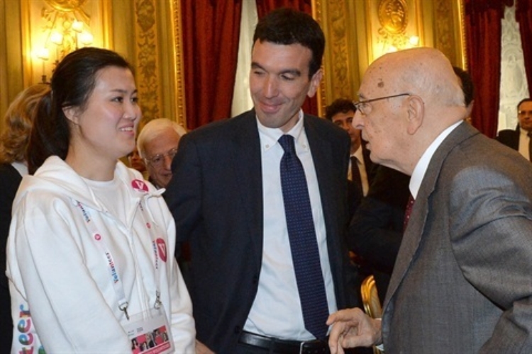 Il Presidente Giorgio Napolitano con la signora Viola Zhang, rappresentante dei volontari in occasione dell'incontro con una rappresentanza di giovani volontari dell'Expo di Milano 2015