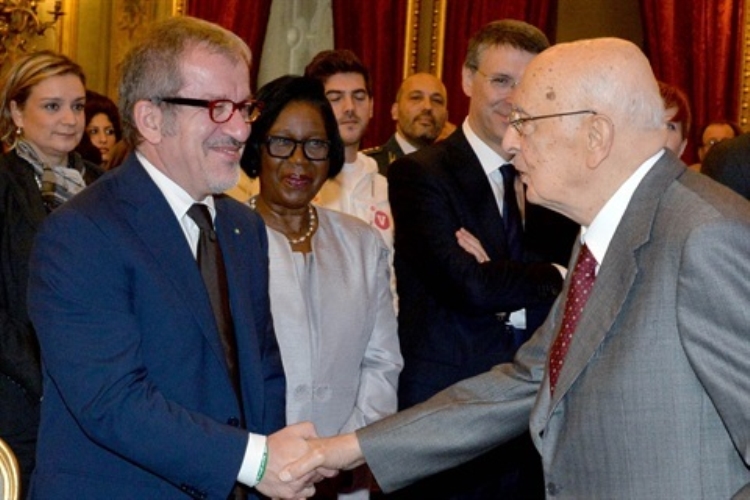 Il Presidente Giorgio Napolitano con Roberto Maroni, Presidente della Regione Lombardia, e Albina Assis Africano, al termine dell'incontro con i giovani volontari di Expo Milano 2015