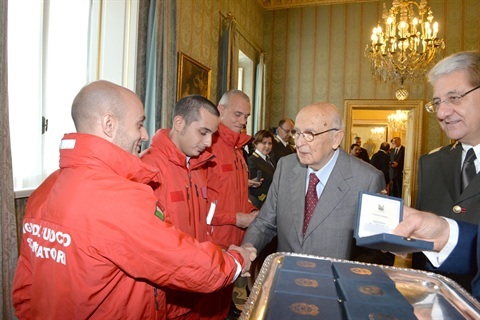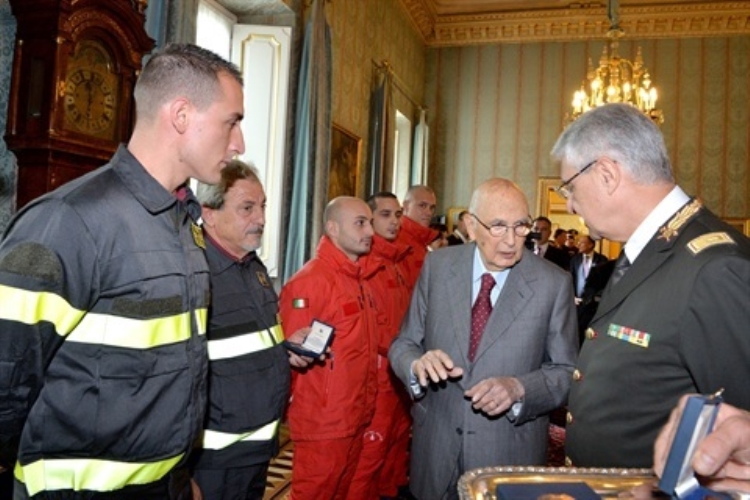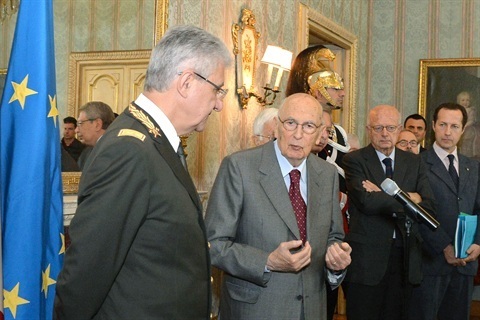 Il Presidente Giorgio Napolitano con il Capo del Corpo Nazionale dei Vigili del Fuoco e Vice Capo Dipartimento Vicario dei Vigili del Fuoco, del Soccorso Pubblico e della Difesa Civile, Gioacchino Giomi, durante l'incontro con una rappresentanza di Allievi degli Istituti di formazione dei Vigili del Fuoco