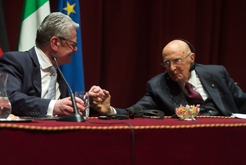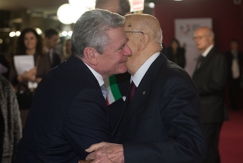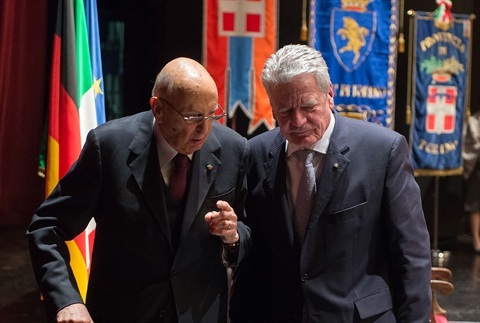 Il Presidente Giorgio Napolitano con il Presidente della Repubblica Federale di Germania Joachim Gauck al Teatro Regio al termine della sessione di apertura dell'Italian-German High Level Dialogue