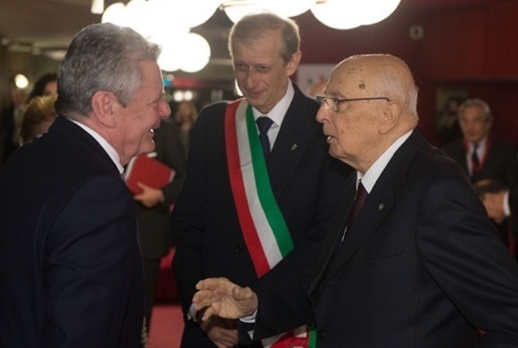 Il Presidente Giorgio Napolitano con il Presidente della Repubblica Federale di Germania Joachim Gauck al Teatro Regio in occasione dell'intervento alla sessione di apertura dell'Italian-German High Level Dialogue