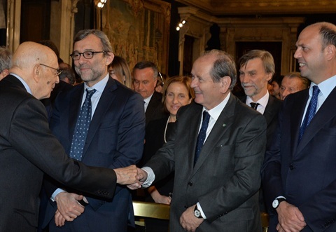 Il Presidente Giorgio Napolitano con i Ministri Padoan, Orlando e Gentiloni nel corso della cerimonia per lo scambio degli auguri di fine anno con i Rappresentanti delle Istituzioni, delle Forze Politiche e della Società Civile