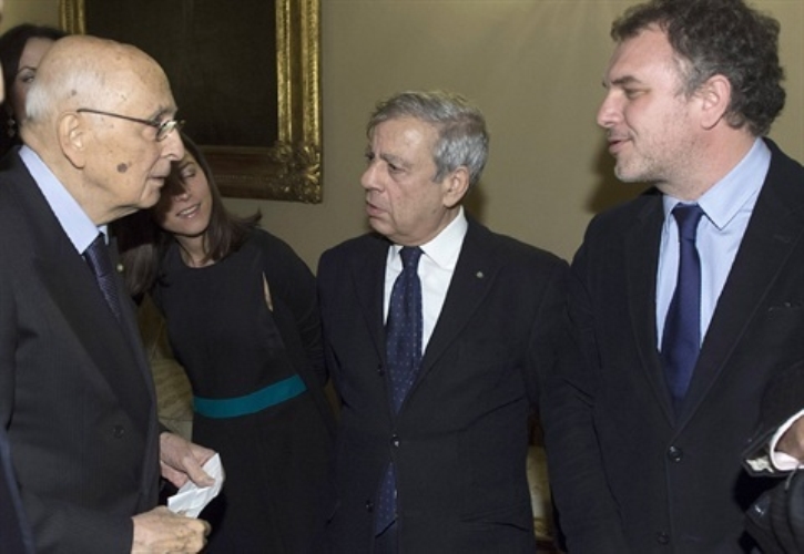 Il Presidente Giorgio Napolitano con Alberto Spampinato, Direttore di "Ossigeno per l'Informazione" e Lirio Abbate, de "L'Espresso" in occasione del consueto scambio di auguri di fine anno