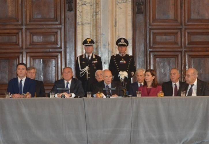 Il Presidente Giorgio Napolitano con il presidente del Senato Pietro Grasso, la Presidente della Camera Laura Boldrini e il Presidente del Consiglio dei Ministri Matteo Renzi nel corso della cerimonia per lo scambio degli auguri di fine anno con i Rappresentanti delle Istituzioni, delle Forze Politiche e della Società Civile