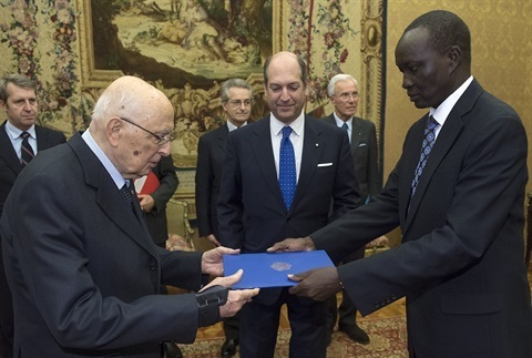 Il Presidente Giorgio Napolitano con S.E. Ajing Adiang Marik, Ambasicatore della Repubblica del Sud Sudan, in occasione della presentazione delle Lettere Credenziali