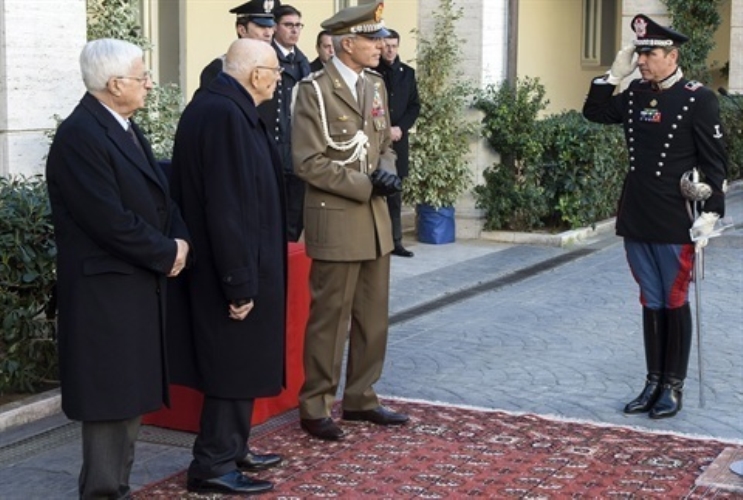Il Presidente Giorgio Napolitano riceve il saluto del Comandante del Reggimento Corazzieri Gen. Paolo Carra in occasione della visita di congedo alla Caserma dei Carabinieri Alessandro Negri di Sanfront